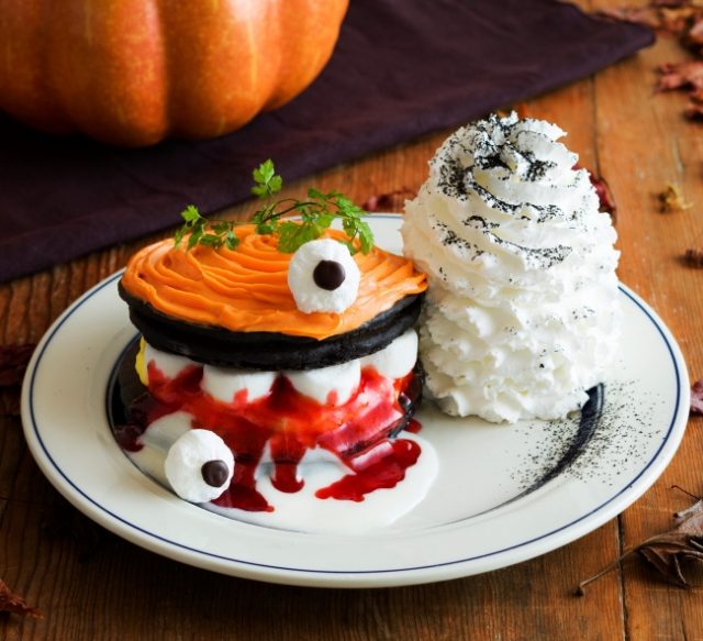 ハロウィンらしく、パンプキンを使用しキュートなモンスターを表現した『パンプキンモンスターパンケーキ』は、ブラックココアのパンケーキにカスタードクリームやマシュマロ、ラズベリーソースをサンドし、マスカルポーネで仕上げたなめらかなパンプキンクリームを盛り付けてあります。