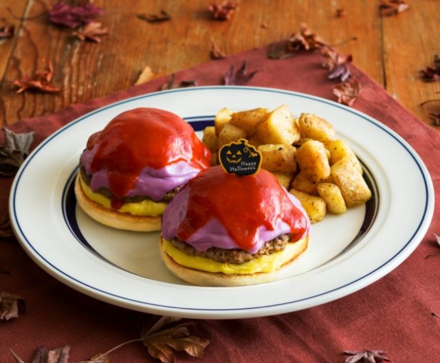 また、同時に発売する『ハロウィンベネディクト』は、パンプキンマッシュポテトとジューシーなハンバーグに紫芋ポタージュをまとわせてあります。ピリッと辛いホットソースがアクセントの食欲が進む一皿です。