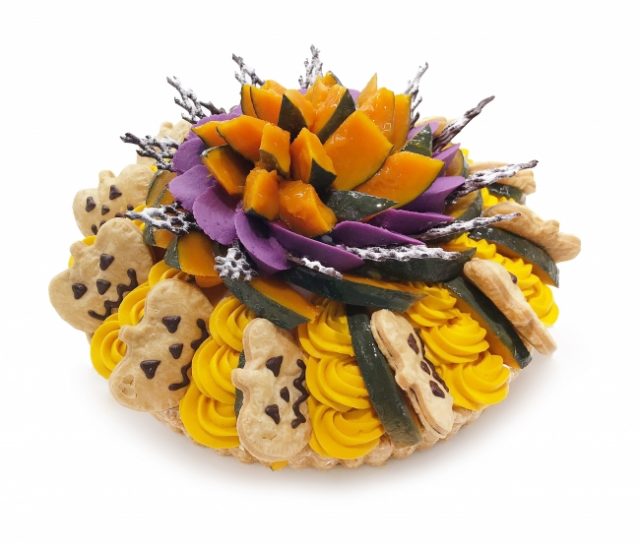 ホクホクのかぼちゃをふんだんに使用し、コクのあるかぼちゃクリームと、紫芋クリームを美しく飾ってあります。ジャックオーランタンを模したサクサクのパイが、可愛らしいデザインです。