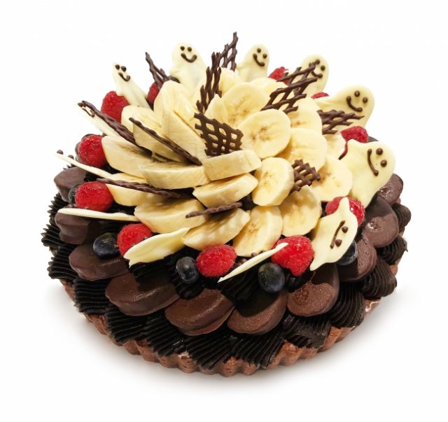 まったりと甘いバナナをほろ苦いビターチョコレートでコーティングし、ブラックココアを加えたマロンクリームと合わせています。ホワイトチョコレートのおばけがユニークなデザインです。