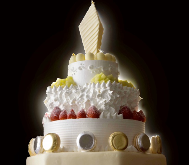 上からホワイトチョコレートの尖塔、シフォンケーキ、『スーパーメロンショートケーキ』、『スーパーあまおうショートケーキ』、そして土台には、ホワイトチョコレートをコーティングしたフルーツケーキとバウムクーヘン、オーナメントには高級シャンパーニュ「ドン・ペリニヨン」が入ったマカロンとボンボンショコラを使用しました。大人数のクリスマスパーティーを盛り上げる、遊び心満点のケーキとなっています。