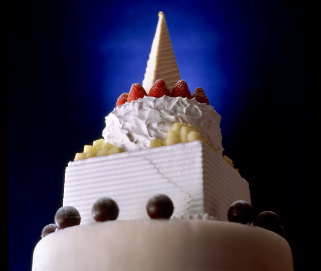 上からホワイトチョコレートの尖塔、『スーパーあまおうショートケーキ』、『スーパーメロンショートケーキ』、そして土台にはホワイトチョコレートをコーティングしたフルーツケーキとバウムクーヘンを使用。オーナメントには高級シャンパーニュ「ドン・ペリニヨン」のボンボンショコラを飾りました。