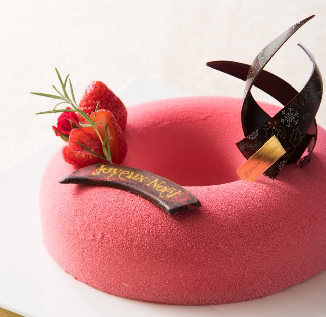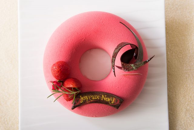 ルビーカカオ豆から生まれた天然のルビー色が美しい、ベルギー・カレボー社製「ルビーチョコレート」を使用したリース型のクリスマスケーキとなっています。アーモンド生地を底地に、苺のムースをのせ、中に苺のコンフィチュールを入れ、鮮やかなピンク色のチョコレートをスプレー。