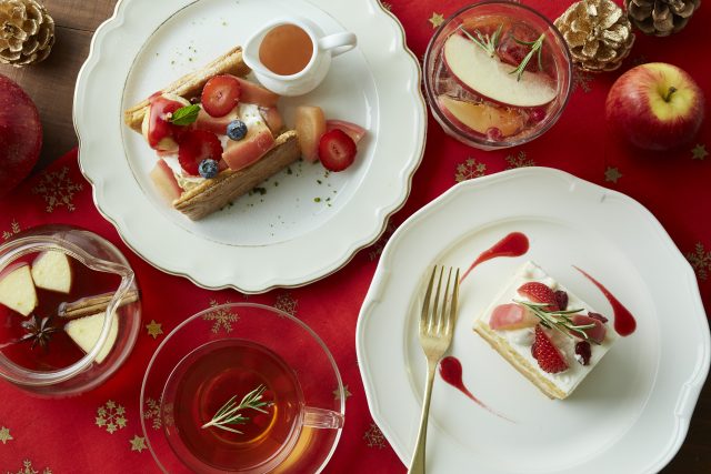 秋から冬にかけて旬を迎えるりんご。豊かな自然で育った“青森りんご”を使用したりんごスイーツが全5種登場します。アフタヌーンティー・ティールームでは、ほんのりラム酒を効かせたアールグレイのカスタードホイップをサクサクのパイでサンドし、自家製アップルコンポート、苺など飾った「林檎とアールグレイカスタードのミルフィーユ」、しっとりした生地にローストした林檎、ほろ苦いカラメルカスタード、林檎ジャム入りホイップクリームをサンドし、自家製アップルコンポート、苺をトッピングした「林檎のショートケーキ」などりんごスイーツを2種発売します。