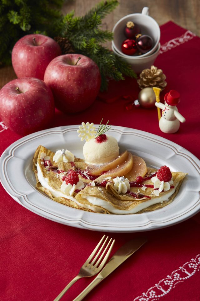 商品説明:青森県産の林檎のコンポートとバニラアイス、甘酸っぱいラズベリーソースを合わせました。ホリデーシーズン限定のライ麦のクレープ。