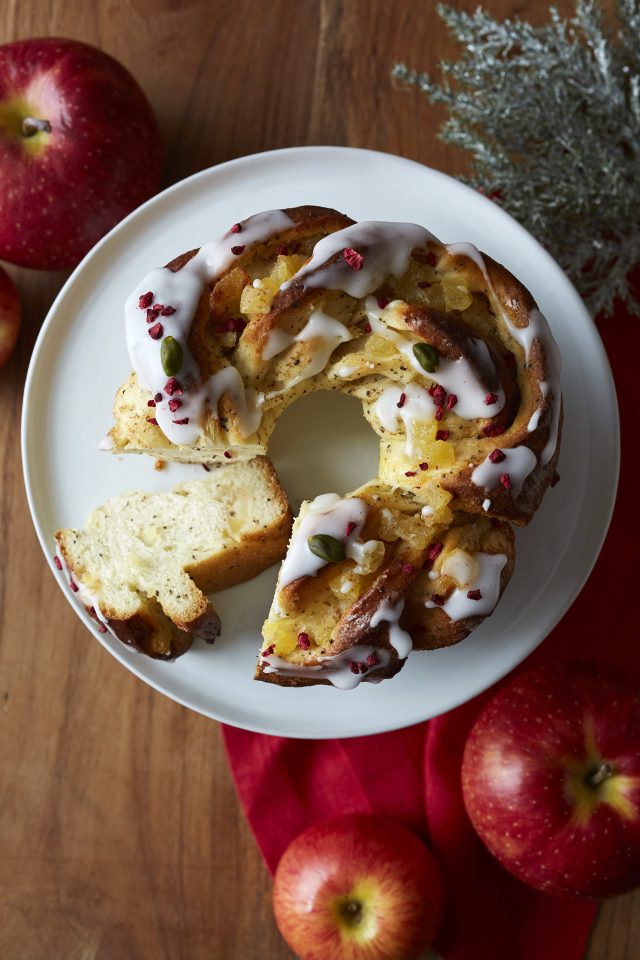 商品説明:アールグレイの茶葉を入れたスイート生地でリンゴとアーモンドクリームを巻き込み、ボリュームたっぷりのリース形に焼き上げました。