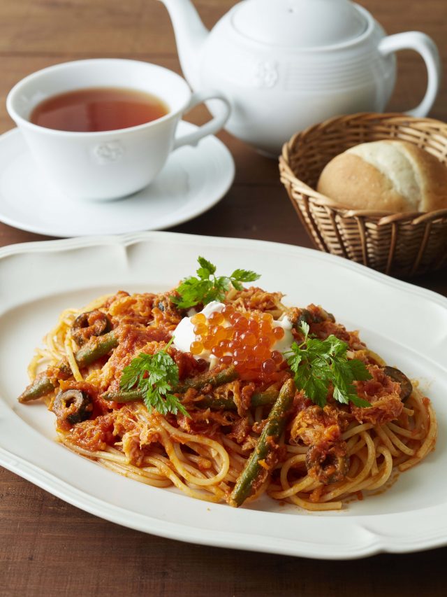 商品説明:紅ズワイ蟹、ブラックオリーブ、ケーパーを加えたまろやかな酸味のトマトソースパスタに、黒胡椒ホイップといくらをトッピング。