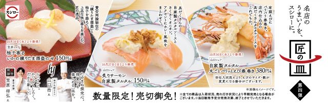 株式会社あきんどスシローは、今年7月より開始した、名店の匠とタッグを組んで“回転すしの常識を超える逸品”を提供する『匠の一皿プロジェクト』の商品を、本日10月30日(水)より全国のスシローにて期間限定で販売します。今回は、「神戸北野ホテル」で総料理長を務める山口氏考案の商品が登場します。