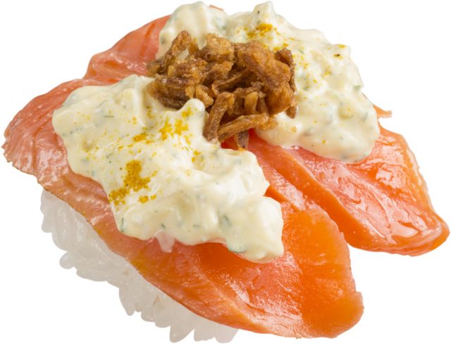 なお、好評販売中の『炙りサーモン自家製タルタル』もオリジナルのタルタルソースを使用しており、人気のサーモンを店内で炙り、タルタルソースをたっぷりとのせ、そこにカレー粉のスパイシーな香りとフライドオニオンの香ばしさが絶妙にマッチする、山口氏だからこそ考案することができた極上の創作すしとなっています。