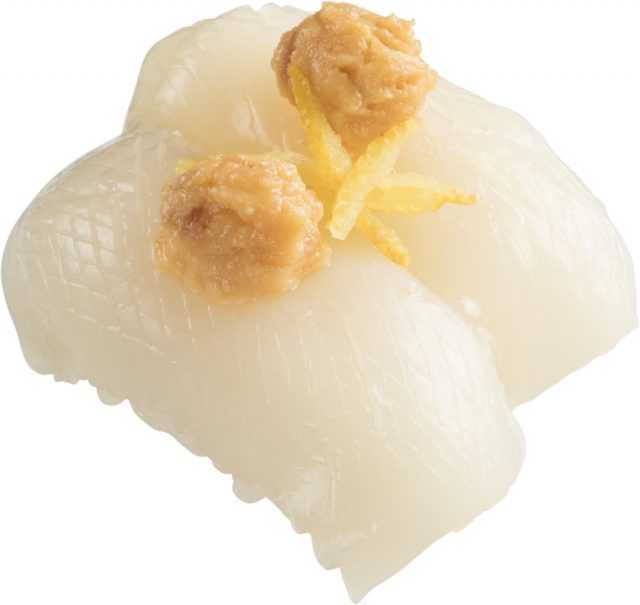 また山口氏考案の商品に加えて、日本料理「賛否両論」の笠原氏が手がける“酒盗”を使用した『柚子香る いかの練りたま酒盗のせ』も登場します。この商品の特徴である“酒盗”とは、魚の内臓を原料とする塩辛で、鰹の内臓を使用した酒盗に卵黄を合わせ、低温でじっくりと練り上げることで、まろやかにコク深い「練りたま酒盗」に仕上げました。柚子を合わせることでアクセントを出しています。醤油を付けずに、そのまま味わってもらいたい創作すしとなっています。