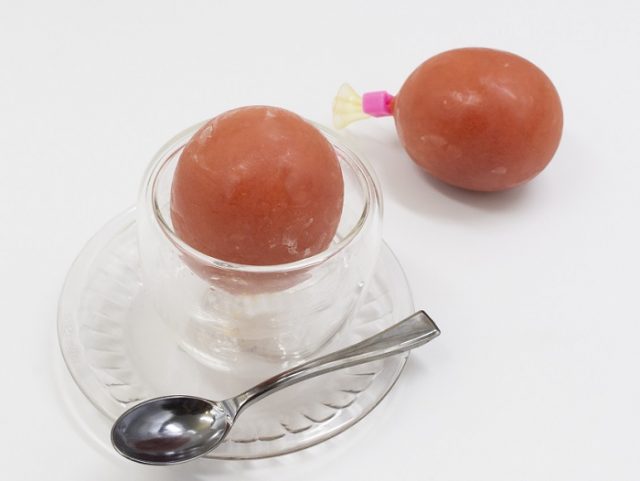 いちごの果汁を使用し、風船に閉じ込めたシャーベット。レモン果汁を少しだけ加えて酸味を調整しています。