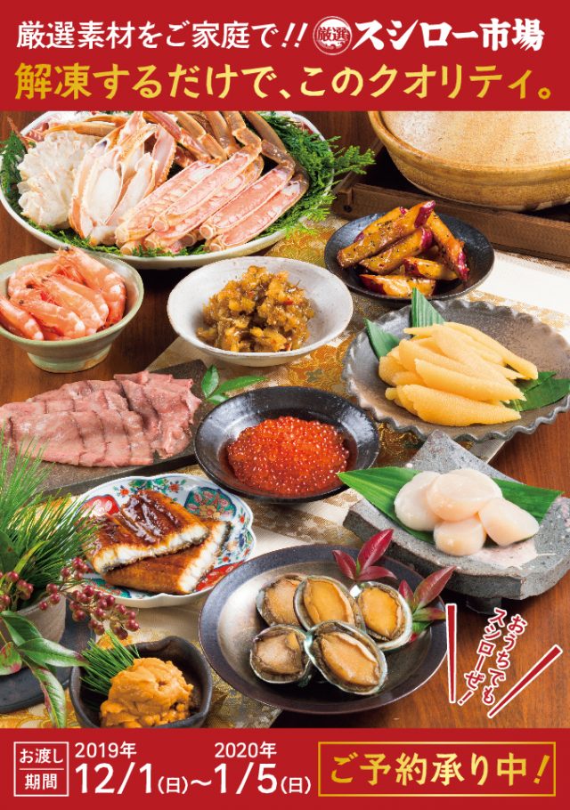 株式会社あきんどスシローは、11月1日(金)より、令和初の年末年始を盛り上げる、豪華な食材を取り揃えた『スシロー市場』予約受付を開始※1します。