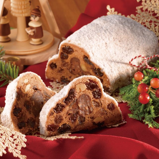 ナッツとオレンジピールを混ぜ込んだガナッシュをセンターに入れたチョコレート生地に、りんごとクルミ、ブランデーに漬けたレーズンを入れました。小さめのサイズで焼き上げた、手軽に食べやすいシュトーレンとなっています。