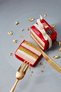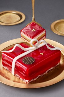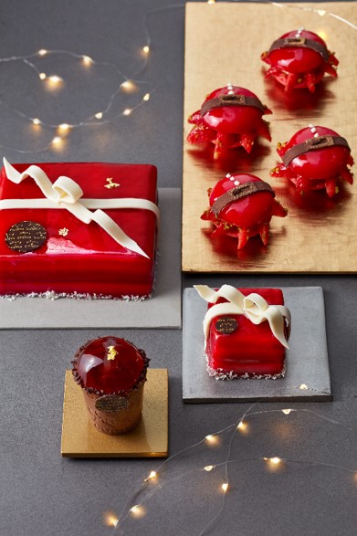 限定ケーキ「クリスマス ストロベリー」は、ストロベリームース、ホワイトチョコレートガナッシュ、ピーチラズベリージェリー、レモンビスキュイの層をクリスマスレッドのグレーズで包み、リボンの形のホワイトチョコレートのデコレーションで、クリスマスギフトをイメージしました。