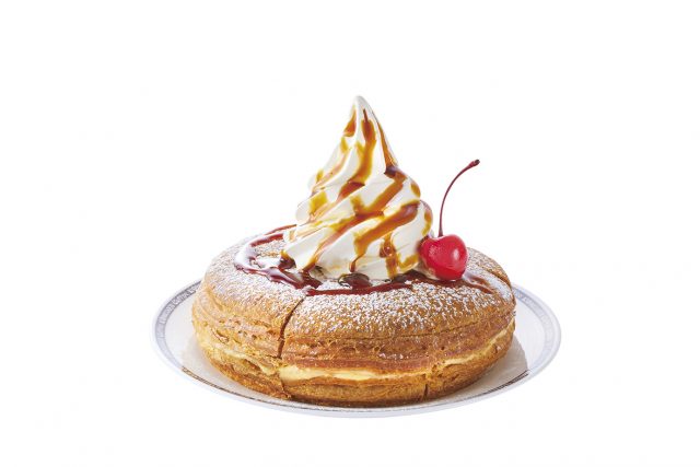 こだわりは、ほかほかのデニッシュパンに挟んだカスタードクリーム。昔ながらの濃厚なプリンを再現すべく、たまごの甘みを感じるなめらかな舌触りのクリームに仕上げました。粉糖をかけたデニッシュパンの上には冷たいソフトクリーム、ほろ苦いカラメルソースをかけ、仕上げにチェリーをトッピング。デニッシュパンに、クリーム、ソース、ソフトクリームを絡めて一口頬張れば、カスタードクリームの優しい甘さとカラメルソースの芳ばしい香りが口の中に広がり、まさにプリンの味わい。大人はもちろん子どもにも親しんでもらえる、王道の味となっています。みんなでシェアできるフルサイズと、ひとりや食後のデザートにぴったりなミニサイズを用意しました。