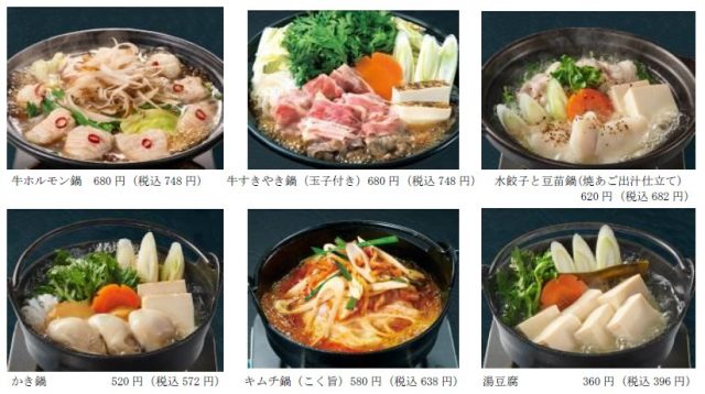 メニューラインナップは、人気の定番品、みそ味が特徴の「かき鍋」、ピリ辛・こく旨の「キムチ鍋」、玉子と一緒に食べたい「牛すきやき鍋」、昆布だしでサッパリ「湯豆腐」の他、秘伝の辛味噌「味源」と合わせていただく「牛ホルモン鍋」、焼あご出汁で仕立てた「水餃子と豆苗鍋」を取り揃えてあります。