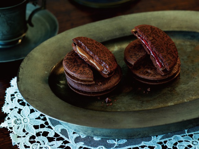 風味豊かな2種類のソースを、ミルクチョコレートでコーティングし、ココアクッキーでサンドした贅沢な味わいのショコラサンドとなっています。濃厚なヘーゼルナッツクリームと、爽やかな酸味のストロベリーソースの2つの味のアソートで。6枚入り1200円/8枚入り1600円/10枚入り2000円/ 16枚入り3200円/20枚入り5000円