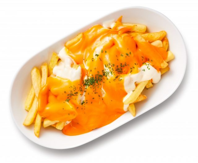 ホワイト&レッドチェダーチーズソースがかかったフライドポテト