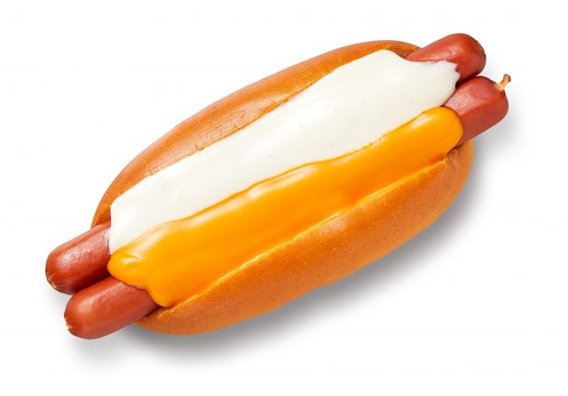 ダブルのソーセージにホワイト&レッドチェダーチーズソースがかかったホットドッグ