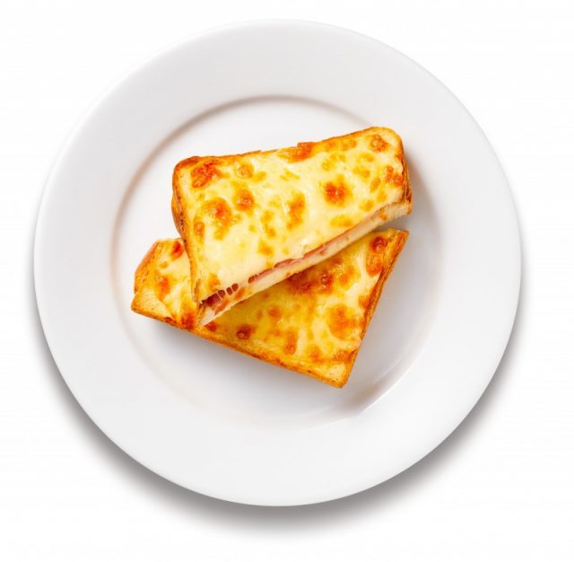 パンにハムとホワイトソース、モッツァレラチーズをはさんだボリューム満点の一品
