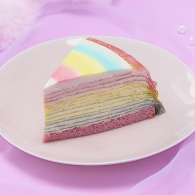 今回は「ミルクレープ」バージョンが登場。4色のクレープを重ね、上面に3色のソースをかけた『レインボーミルクレープ』は、4個並べると、まるで空にかかる大きな虹のよう!インスタ映え抜群の商品となっています。