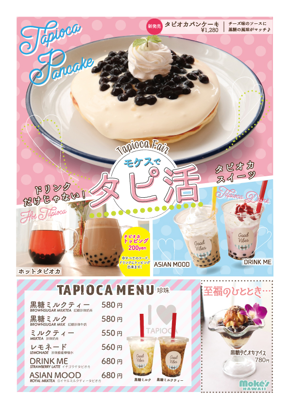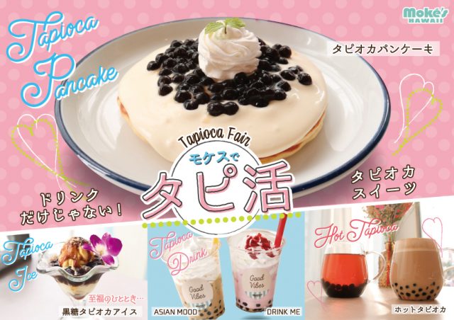 ハワイで行列のできるレストラン「モケス ハワイ」中目黒店では、ドリンク、パンケーキ、アイスクリームなど、あらゆるメニューでタピオカを楽しめる「タピ活」を開催しています。