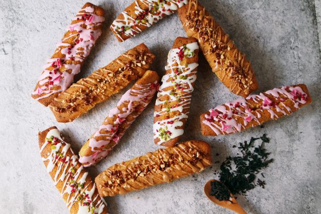 見た目にも華やかなベイクドバーマフィンは、THE ALLEY 一番人気「ロイヤルNO.9」の茶葉を生地に練り込んでいます。「ロイヤル№9」は、ベリーの香りが豊かなフルーティーな紅茶。そのベリーの香りが口の中に広がる、THE ALLEYならではの一品となっています。味は、きなこ、ホワイト、ベリーのチョコをそれぞれデコレーションした3種類。見た目も味も華やかな、ベイクドバーマフィンをぜひご賞味あれ。
