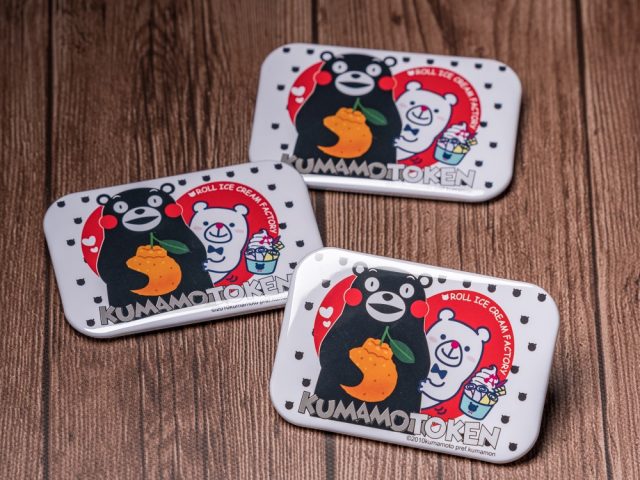 同社の公式キャラクターくるくるアイスの「シロくん」と、くまモンとの“クマ”つながりということで「くまモン&シロくんのスペシャルデザインカップ」で提供。セットにはオリジナルのコラボビッグ缶バッジがついています。台北店でも缶バッジセットは販売予定です。