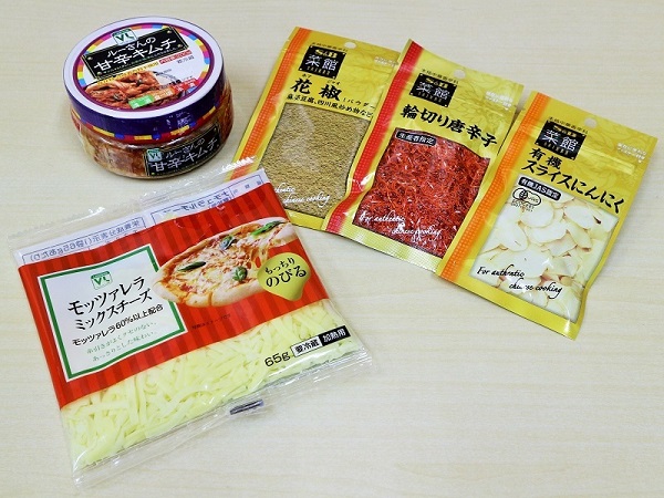VLルーさんの甘辛キムチ/ VLモッツァレラミックスチーズ/花椒/輪切り唐辛子/有機スライスにんにく(各・税込108円)