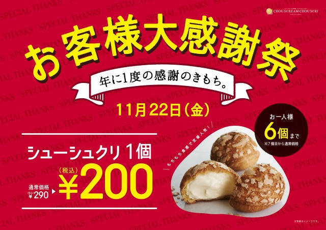 日頃のご愛顧に感謝をこめて、2019年11月22日(金)“シュクリムシュクリの日”に『シューシュクリ(カスタード)』を1個200円(税込)で販売する企画を実施します。1日限りの特別企画となっています。