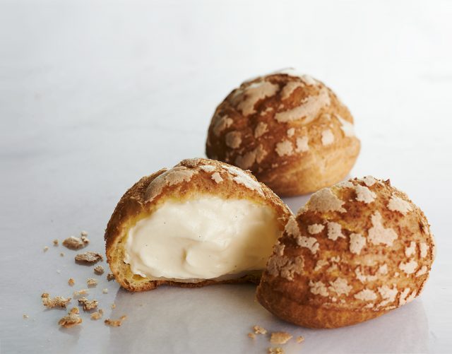商品説明:やさしい風合いのシュー生地、弾力のあるモチモチの生地、表面にはクリスピーな極薄のマカロン生地。3層が織りなす食感にときめく、まったく新しいシュークリームです。