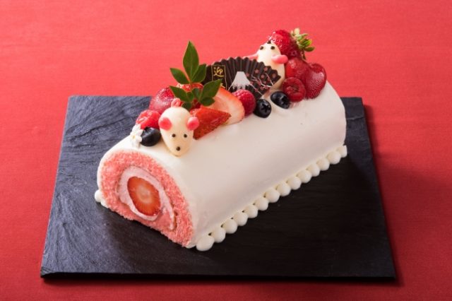 干支スイーツは、その年の干支をモチーフにパティシエの遊び心を生かし作るロールケーキで、2010年から販売を開始しました。2020年は干支「子」にちなみ、ねずみをあしらった苺のロールケーキを用意。ピンク色の生地で苺と苺のクリームを巻き、トップにはチョコレートでできた可愛いねずみと苺やフランボワーズ、赤スグリのパート・ド・フリュイ(ゼリー)などを飾ってあります。苺の赤と外側のクリームの白、紅白カラーもおめでたいひと品です。「子(ね)」は干支の始まりに当たり、多産であることから繁栄の象徴でもあります。2020年を新たな気持ちでスタートし、実り多い年でありますようにと願い、パティシエが1つ1つ心を込めて作ります。