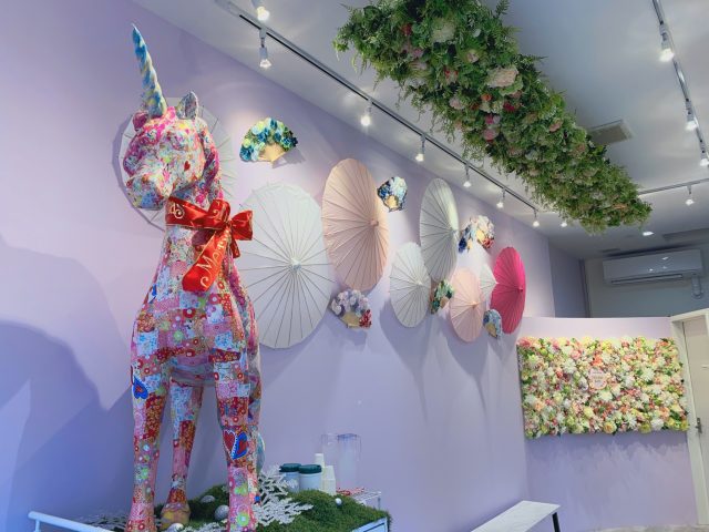 和と洋を美しく可憐に融合させた空間は、浅草という土地柄をイメージした傘や扇子、洋のイメージからくるユニコーンは、花々で彩られています。これらに囲まれた空間は、いまインスタグラムにて話題沸騰中です。