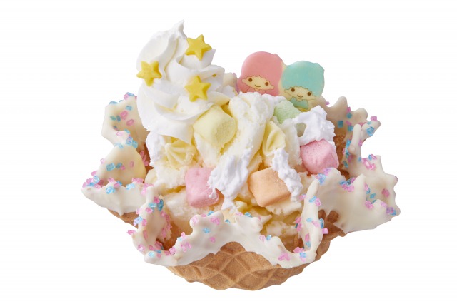 リッチミルクアイスクリーム、ホワイトチョコチップ、パステルマシュマロ、ホイップクリーム、スターチョコ、キキララチョコプレート、カラースノーチョコワッフルボール
