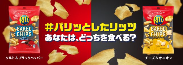 新フレーバーの発売を記念して「#パリッとしたリッツ あなたはどっちを食べたい?キャンペーン」を2019年12月2日(月)~2019年12月15日(日)に実施します。Twitterのリッツ公式アカウント(@Ritz_mdlz)をフォローの上、タイムライン上のカンバセーショナルカードにて【ソルト&ブラックペッパー】【チーズ&オニオン】のいずれかを選んで応募するか、または、指定のハッシュタグ「#パリッとしたリッツ」と、回答のハッシュタグ「#ソルト&ブラックペッパー」「#チーズ&オニオン」のいずれかを付けてツイートし応募すると、回答者の中から抽選で500名にベイクドチップス2種(ソルト&ブラックペッパー・チーズ&オニオン)各2個ずつ+オリジナルトング1個をプレゼントします。