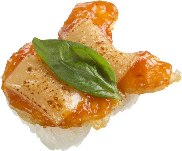 スパイスや香草を巧みに使いこなし、多種多様な料理を生み出している京都の名店「ブランカ」の吉岡氏が手がける『創作いかソウルにぎり』は、ふわっと香るごま油などでイカソーメンを味付けし、ピリッとした辛味と旨味を兼ね備えたコチュジャンを絡めることで、同氏ならではの独創性あふれる韓国風の創作すしに仕上げました。さわやかな大葉と、パリッとした韓国のりの2種類の食べ比べができるお得な一皿となっています。