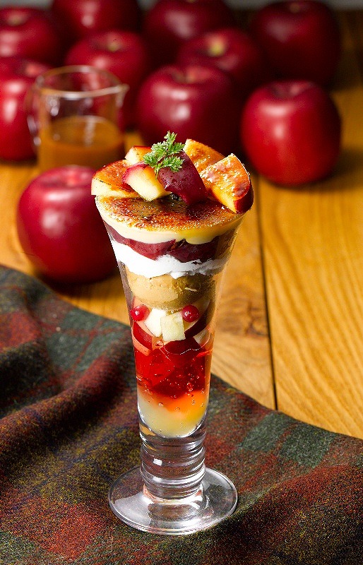大人気のブリュレパフェ。カリッとしたクレームブリュレ、紅玉焼きりんご、りんごのソルベやゼリーなど、贅沢にりんごを使用したさわやかなパフェとなっています。