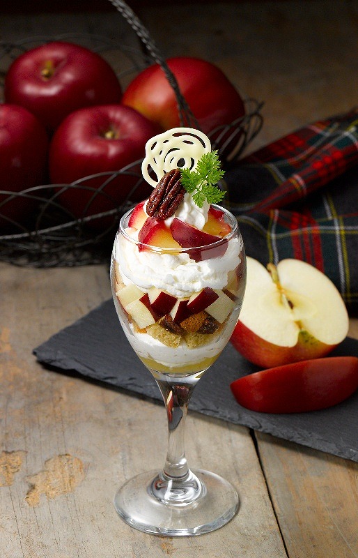 フレッシュなりんご、焼きりんご、りんごのソルベやゼリーなど、1つのパフェの中で、層ごとに異なる味わいを楽しめるようになっています。