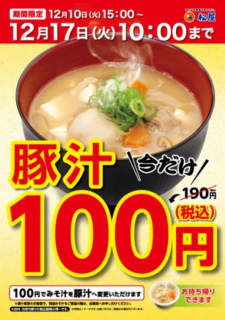 松屋フーズ(本社:東京都武蔵野市、代表取締役社長:瓦葺一利)では、牛めし・カレー・定食・その他丼の「松屋」において、2019年12月10日(火)午後3時から12月17日(火)午前10時まで、「豚汁100円フェア」を期間限定にて開催します。