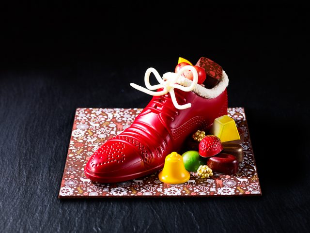 「おしゃれサンタの靴」はクリスマスという特別な日にサンタクロースが履いている靴をイメージしたチョコレート細工。フランスから取り寄せた型を使用し、まるで本物の革靴のように仕上げた靴の中には、THE SHOP at the Park人気のフレーバーのチョコレートが詰め込まれています。