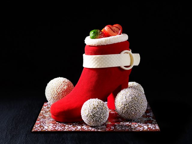 真っ赤なブーツに白のベルトが可愛らしいショートブーツ型チョコレート「クリスマスブーツ」は、スエードのような質感にこだわった一品。ブーツの中にはアーモンドをあまおう風味のチョコレートで包んだお菓子「あまおうアマンド」や、女性に人気のハートやストロベリーの形のチョコレートが入っています。