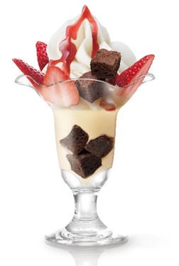 濃厚なバニラカスタードアイスクリームに、ごろっとしたチョコレートブラウニーを混ぜ合わせ、天面には甘酸っぱいストロベリーソースをたっぷりと敷きつめました。3種の味わいと異なる食感が織り成すパフェのような複合的な味わいを楽しめるようになっています。