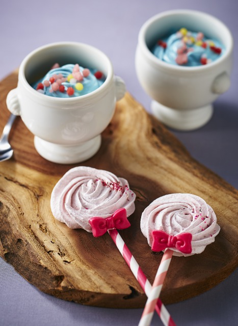ウエルカムスイーツには、かわいらしい見た目とふわふわの食感が楽しい「魔法のマシュマロステッキ」と、見習い魔女が初めて作った魔法のスイーツをイメージした「魔女の壺」を1名に1セット用意します。「魔女の壺」は、マローブルーのハーブティーを使った青いメレンゲと白いヨーグルト、ベリーの実の3層仕立てで、中身を混ぜると色が変化します。