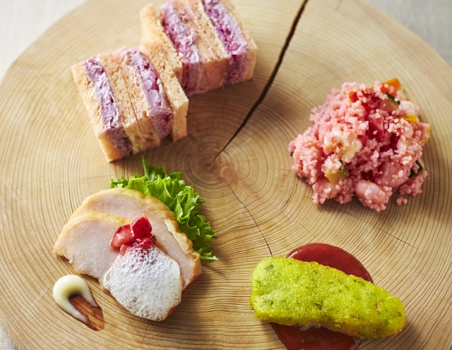 軽食は、紫の春雨にヴィネガーをかけると赤色に変化する「魔女のサラダ〜春雨と豆乳豆腐のサラダ仕立て」をはじめ、「紫芋とポテトのスープ〜魔女をイメージして」や「フライドポテト~魔女の煎じた粉」、「ハンバーガー~苺のピクルス」などの趣向を凝らした約16種のメニューがラインアップします。