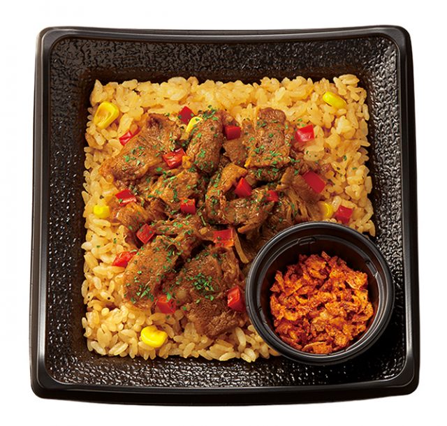 角切りカルビと焼肉のタレと混ぜ合わせ、ゴロゴロとした食べごたえのある具だくさんのおにぎりとなっています。韓国のりフレークを振りかけることで牛角商品の「カルビ専用ごはん」をおにぎりで再現しました。