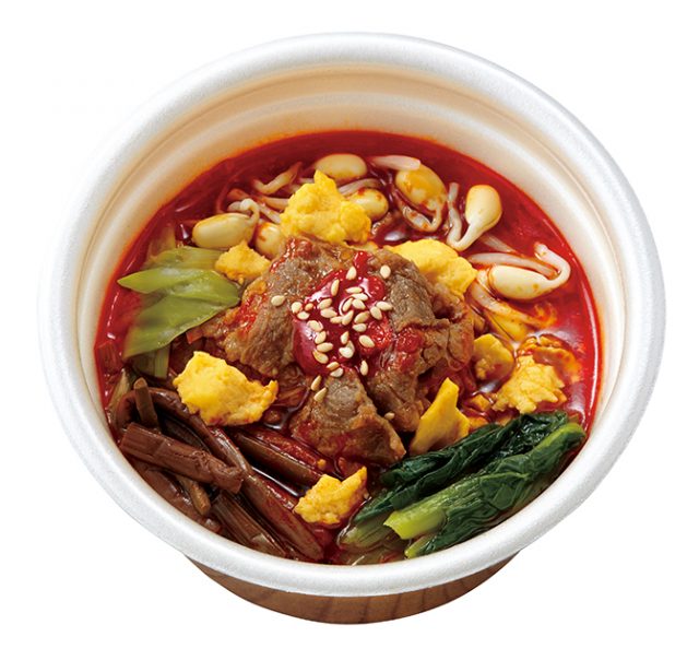 タレ和えの牛肉、野菜、たまごを使い、加熱前の彩りも意識して仕上げました。レンジ加熱後は辛味が強そうな赤色のスープに仕上がりますが、食べると程良い辛味と旨みのある味となっています。