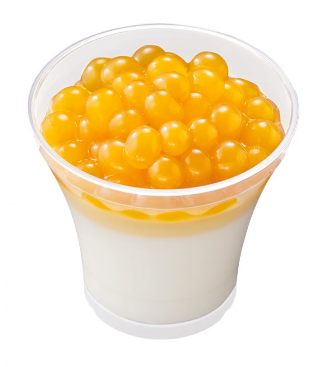北海道産の純生クリームを使用した杏仁豆腐に、マンゴームースとマンゴー味のポッピングボバをトッピングしました。