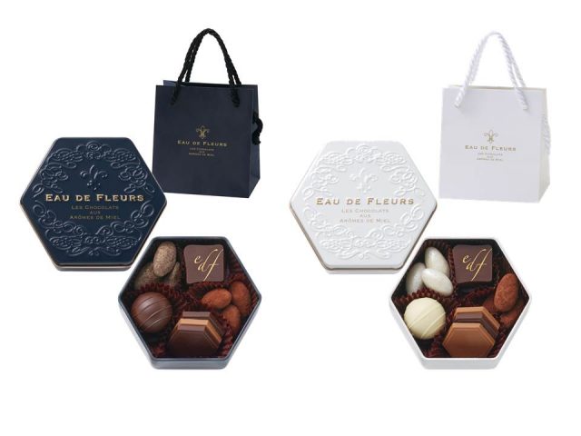 シックなネイビーのボックスには、3種類の蜂蜜を使ったガナッシュ入りチョコレートと、トリュフチョコレートを。オフホワイトのボックスには、マンディアンやハニーフレーバーアーモンドも加えたラインナップを贅沢にアソートしました。