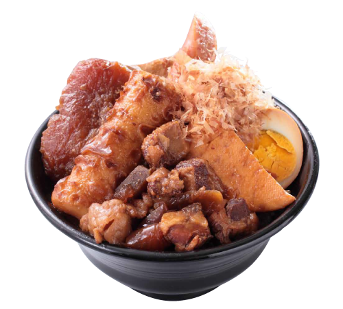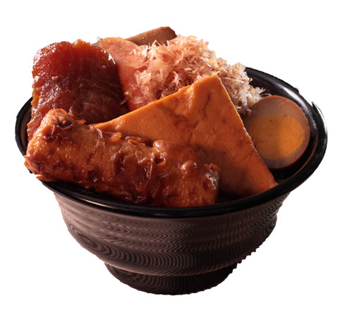 冬になると食べたくなる"おでん"。大根をはじめ、ちくわ、豆腐、玉子、ソーセージ、はんぺんを、岡むら屋特製の煮込みだれでじっくり煮込んで、ごはんにドンっと盛り付けた"おでんめし"。