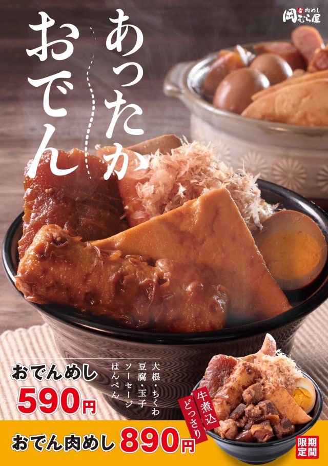 とんかつ専門店「かつや」などを展開するアークランドサービスホールディングス株式会社の子会社、アークダイニング株式会社(本社:東京都千代田区/代表:岡村 俊美)は、肉めし専門店「岡むら屋」にて「おでんめし」を12月16日(月)より期間限定で販売します。